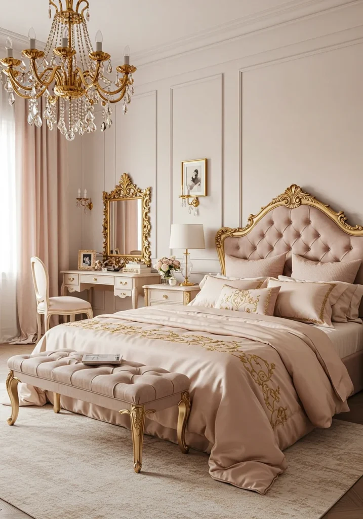 Feminine Luxury Bedroom with Blush Tones and Gold Décor