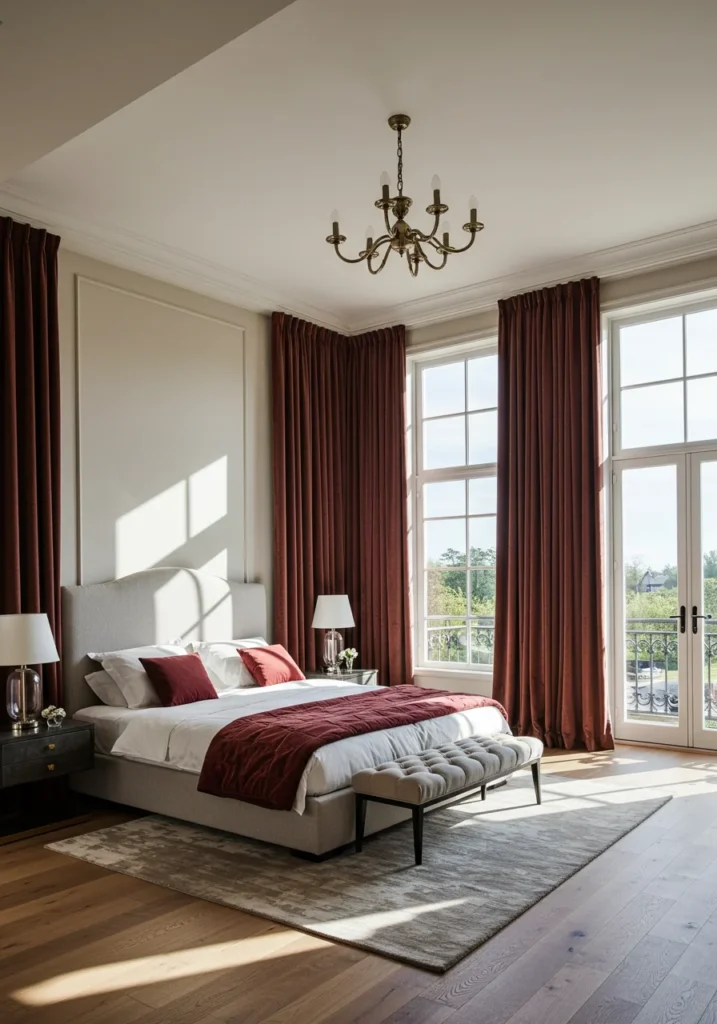 Height and light are the twin luxuries in this grand master suite. Towering ceilings open the space dramatically, while oversized windows flood it with daylight. Tall drapes in flowing fabric frame the architecture, emphasizing verticality and movement.
