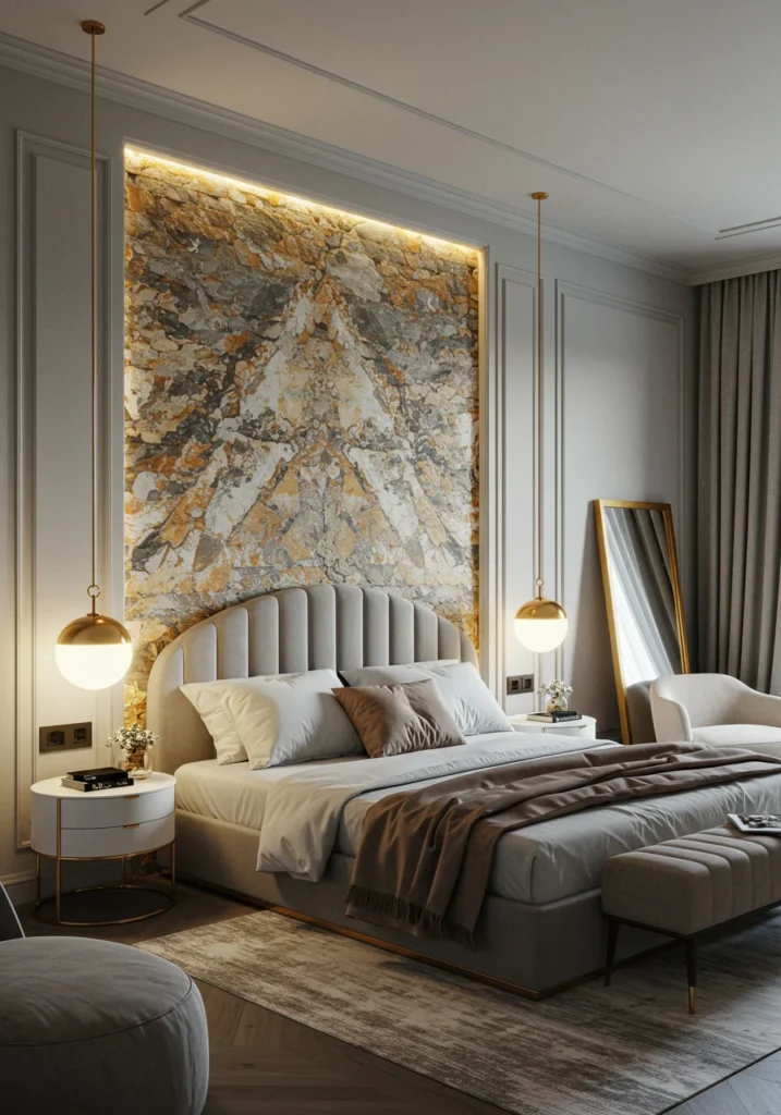 Modern Luxury Master Bedroom with Marble Walls and Warm Lighting