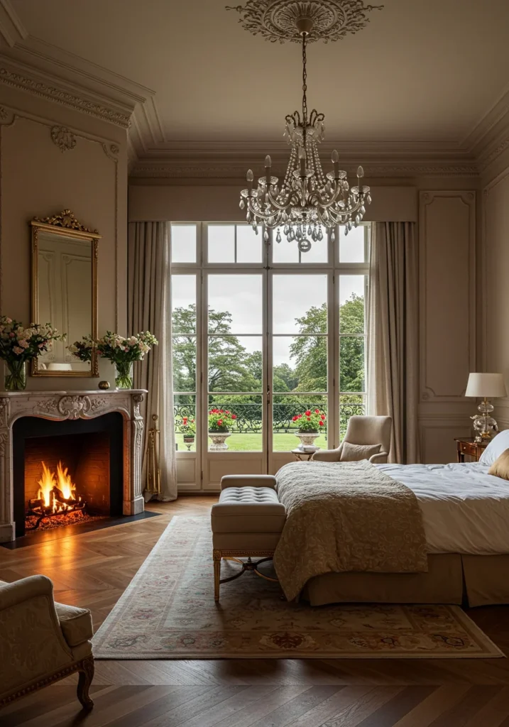 Add vintage-style lighting, such as a crystal chandelier or antique wall sconces, to heighten the romantic atmosphere. A velvet chaise, patterned rug, or tufted headboard complements the French aesthetic. Gold detailing across mirrors, hardware, and decor infuses elegance without excess. This bedroom balances opulence with refinement, offering a perfect blend of history, art, and contemporary style.