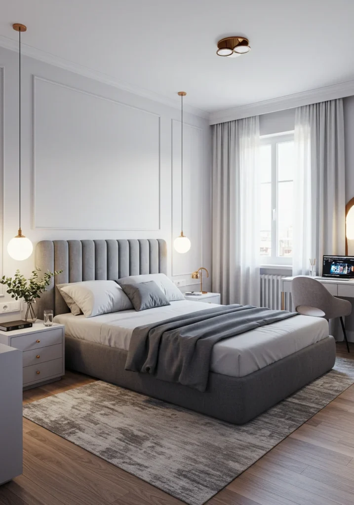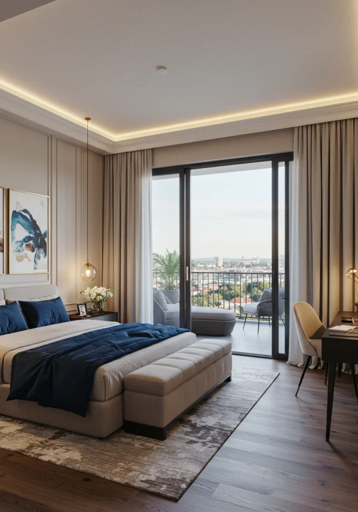 In urban apartments, luxury is measured by how smartly space is used. This compact master bedroom embodies efficiency without sacrificing style. Built-in wardrobes, floating shelves, and multi-functional furniture maximize every inch. The color palette — soft greys, beige, and white — visually expands the room, while concealed lighting enhances the modern vibe.