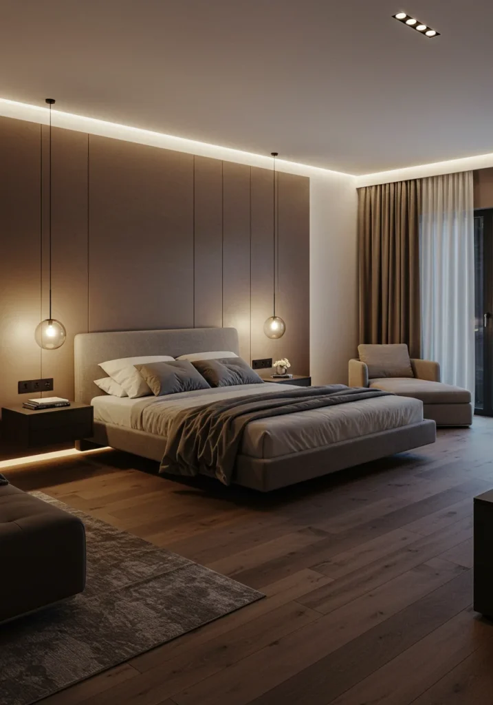This minimal-modern master bedroom celebrates discretion and harmony through sleek, hidden wardrobe design. Built-in storage blends seamlessly with wall panels, keeping the space clutter-free and visually open. The color scheme—soft greys, beige, and ivory—creates a calm, cohesive atmosphere enhanced by concealed LED lighting and smooth matte textures. Every surface, from the floor to the ceiling, contributes to an uninterrupted aesthetic of sophistication and simplicity.