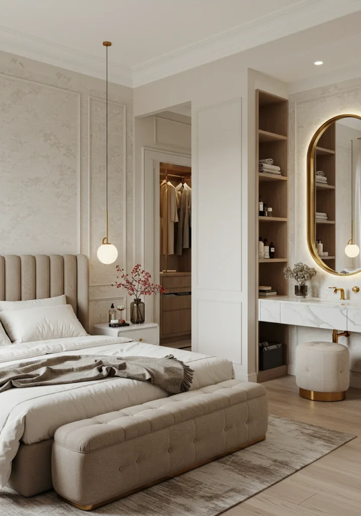 Gold-framed mirrors, pastel artwork, and statement lighting enhance the glow, while neutral furniture grounds the space. Add floral arrangements or soft-textured rugs for depth and comfort. Every element, from lighting to linen, whispers luxury without excess — a space designed for tranquility, beauty, and personal indulgence.