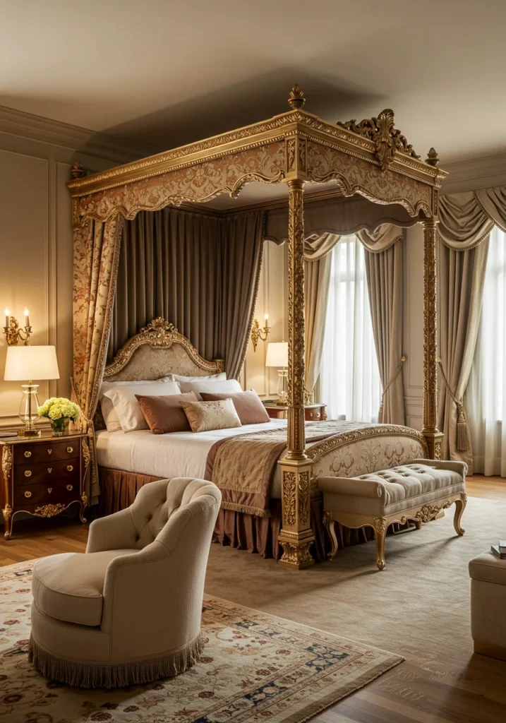 To enhance the atmosphere, integrate warm metallic accents, sheer curtains, and subtle textures such as linen or silk. A chandelier above the canopy can add a regal finish, while soft wall sconces balance the glow. The result is a bedroom that feels both majestic and modern — a dreamy retreat that transforms rest into an experience of artful luxury.