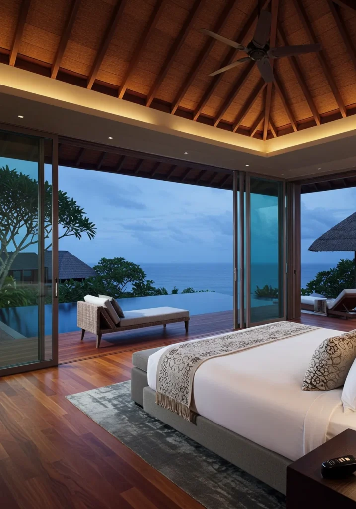 Soft drapery, natural lighting, and seamless flooring unify indoor and outdoor zones. Subtle gold accents or marble details enhance elegance without stealing focus from the view. Every element is curated to evoke serenity, sophistication, and escape. This villa-inspired suite transforms daily rest into a sensory retreat surrounded by natural beauty.
