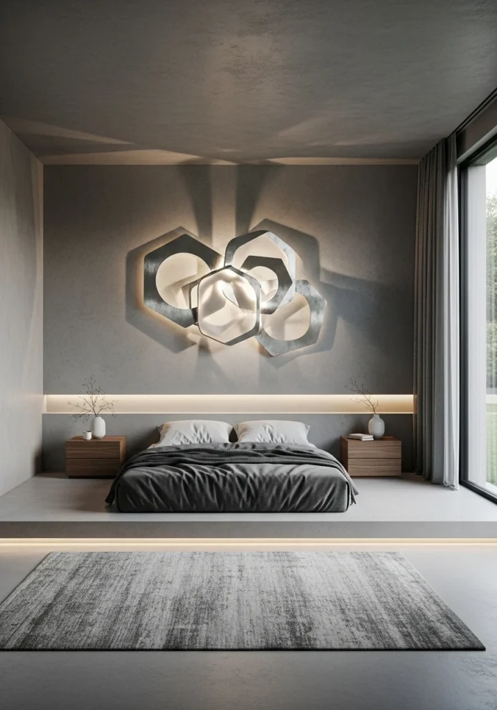 Minimalism meets artistry in this concrete-clad master bedroom. Polished cement walls provide an industrial canvas, while strategic lighting highlights their sculptural texture. Clean lines, low furniture, and a monochrome palette create an atmosphere of serene sophistication. A single modern art installation—abstract sculpture or large canvas—acts as the emotional centerpiece.