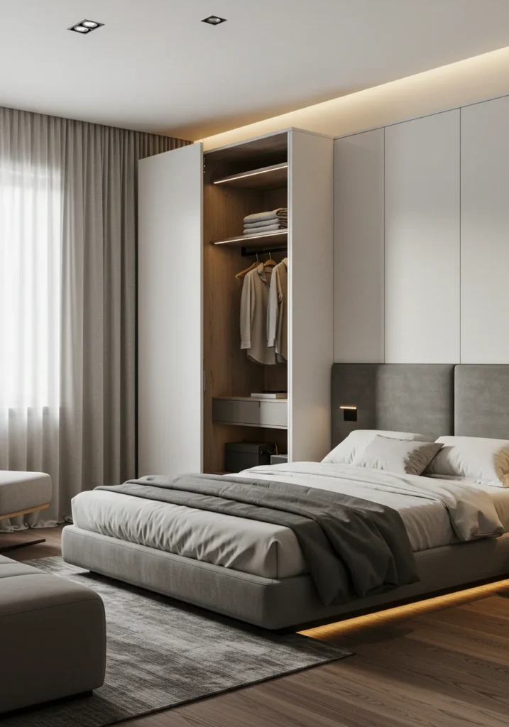 Minimal décor doesn’t mean lifeless; carefully curated pieces like a sculptural lamp, neutral abstract art, or textured bedding add depth and warmth. Wooden flooring or a woven rug provides a subtle natural contrast. The hidden wardrobe serves as a design statement—functional, refined, and beautifully understated. This bedroom defines quiet luxury, where organization meets artistry.
