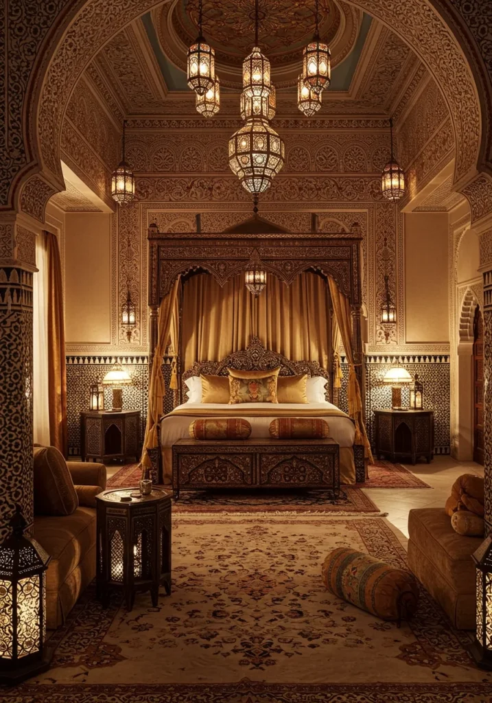 Moroccan Luxury Bedroom with Lantern Lights and Detailed Patterns