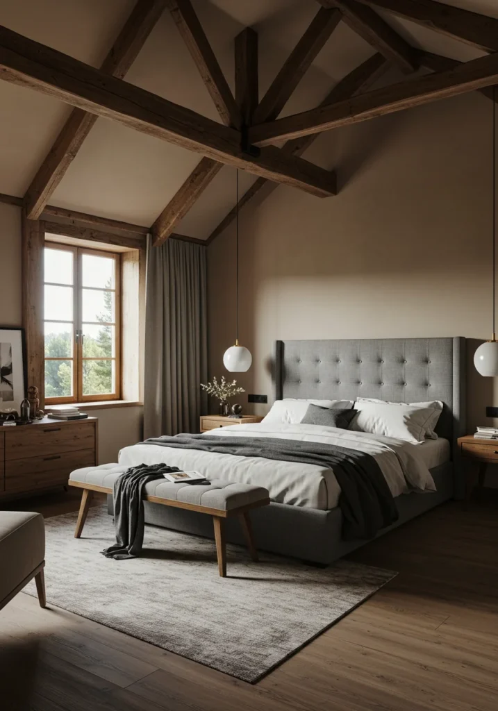 Rustic-Modern Master Bedroom with Wooden Beams and Neutral Tones