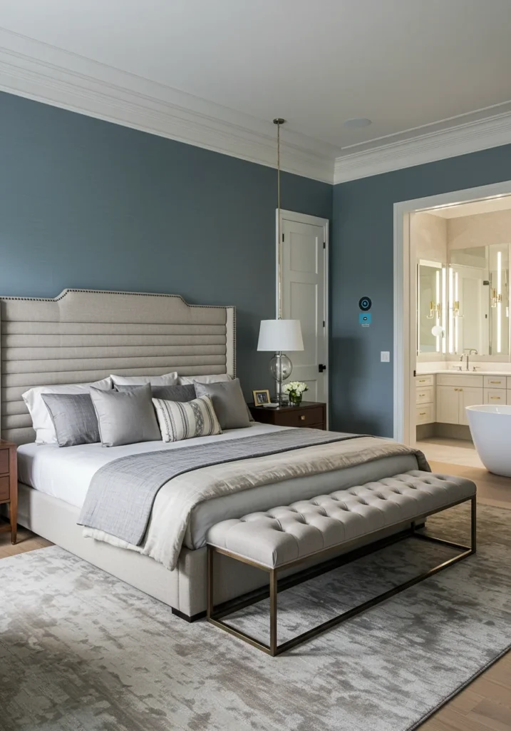 Technology meets luxury in this master bedroom designed for the modern age. Voice-activated systems control lighting, blinds, and temperature, while motion-sensor LEDs illuminate pathways softly at night. Sleek panels conceal smart features, maintaining a clean, contemporary aesthetic. The emphasis is on convenience wrapped in sophistication.