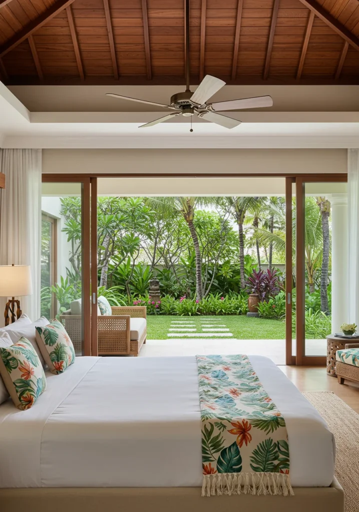 Natural fabrics like rattan, linen, and bamboo enhance the breezy feel, while sheer curtains and ceiling fans evoke resort comfort. Incorporate potted palms or tropical plants to complete the paradise vibe. Every detail—from the texture of the wood to the play of sunlight—invites slow mornings and peaceful nights in a luxurious tropical escape.
