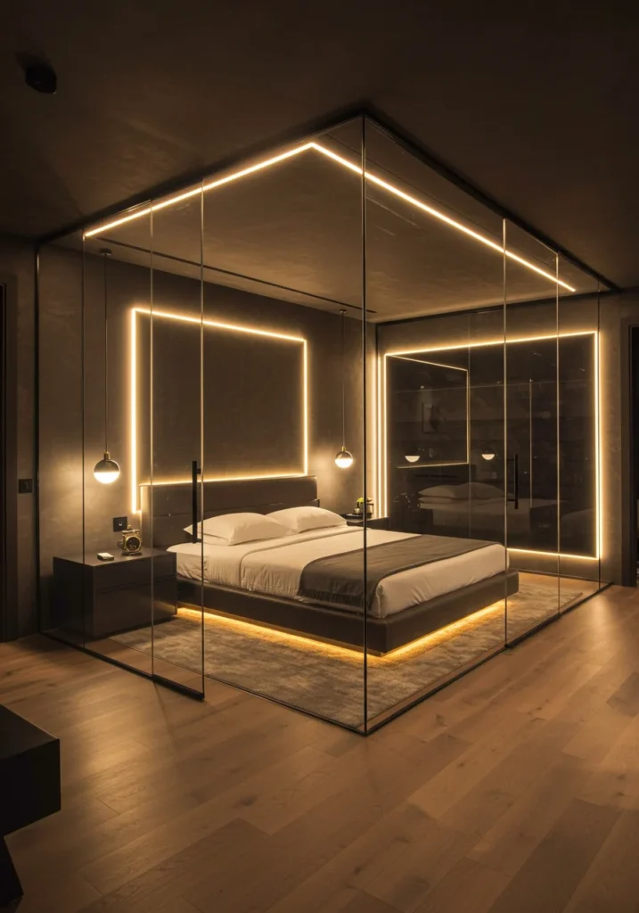 Ultra-Modern Luxury Bedroom with Glass Partitions and LED Strips