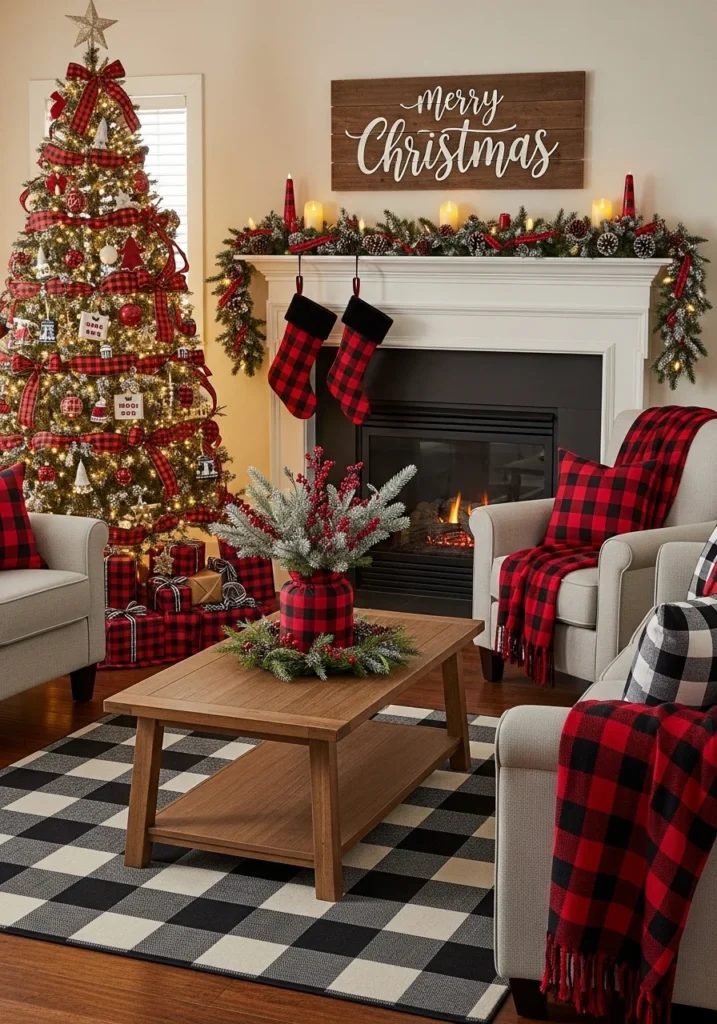 Black and red buffalo check Christmas décor creates a bold and classic holiday aesthetic in the living room. The iconic check pattern evokes rustic charm while remaining versatile enough for modern interiors. Incorporating plaid cushions, throws, and stockings instantly adds warmth and seasonal appeal.