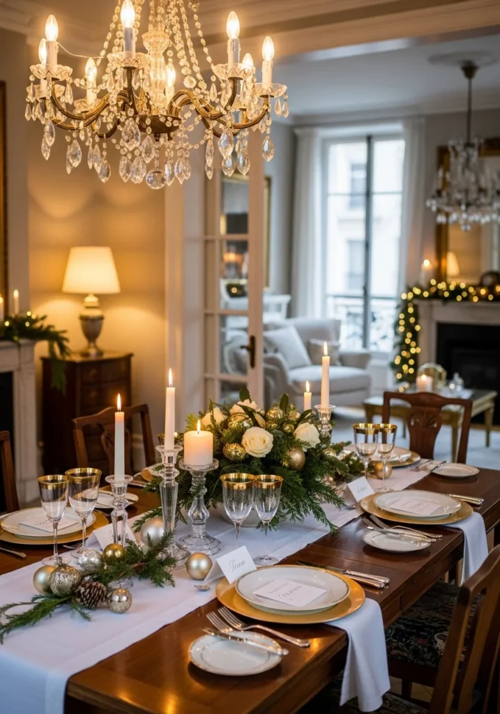 Metallic elements such as gold candleholders, mirrored trays, and metallic garlands introduce shine and refinement. Soft textures like faux fur throws, velvet cushions, and satin fabrics enhance the sense of luxury. Lighting plays a crucial role, with warm-toned LED lights reflecting beautifully off metallic surfaces.