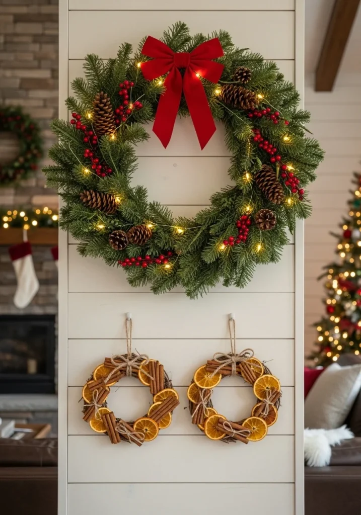 This décor approach is ideal for those who enjoy hands-on projects and personalized holiday styling. DIY wreaths provide unique, festive charm while showcasing creativity. They bring warmth, character, and a handcrafted touch to the living room, making the space feel lively and welcoming.