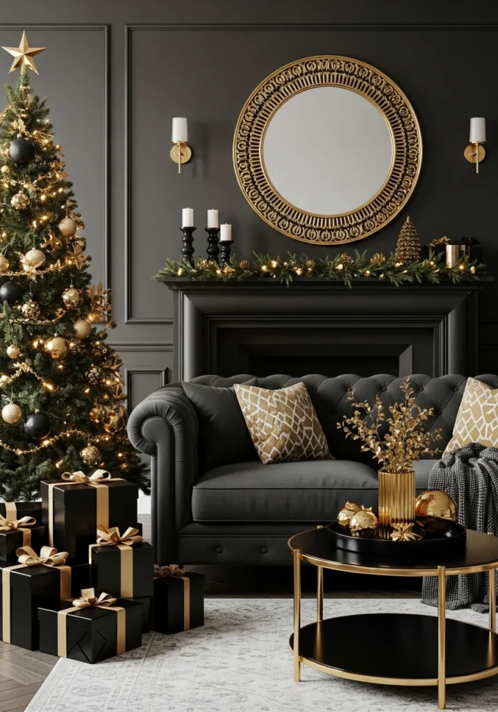Elegant black and gold Christmas décor delivers a dramatic and luxurious aesthetic that instantly elevates the living room. The bold contrast between deep black accents and shimmering gold elements creates a sophisticated and modern holiday look. Black ornaments, gold ribbon, and metallic garlands contribute to a striking and cohesive theme.
