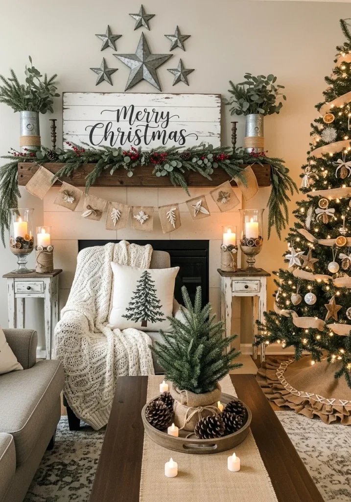 Garlands made from fresh or faux greenery, paired with burlap ribbons, add texture and seasonal flair. Incorporating galvanized metal accents, woven baskets, and wooden signage enhances the farmhouse appeal. Soft textiles such as plaid throws, linen cushions, and knitted stockings contribute to a cozy and lived-in feel.