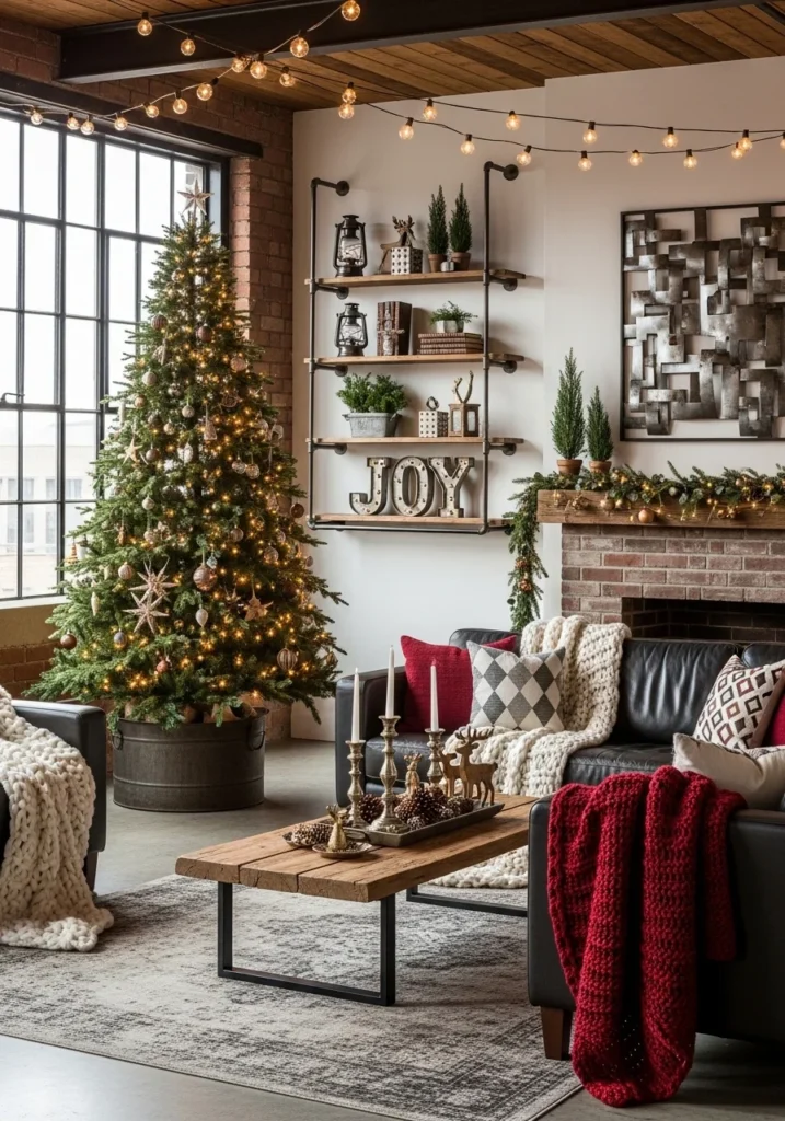 Industrial loft Christmas décor combines raw textures, metal accents, and natural wood elements to create a modern, urban holiday aesthetic in the living room. Exposed surfaces, minimalist furniture, and neutral tones provide a sleek backdrop for festive decorations. A tree with metal ornaments, wooden accents, and subtle greenery maintains the industrial vibe.