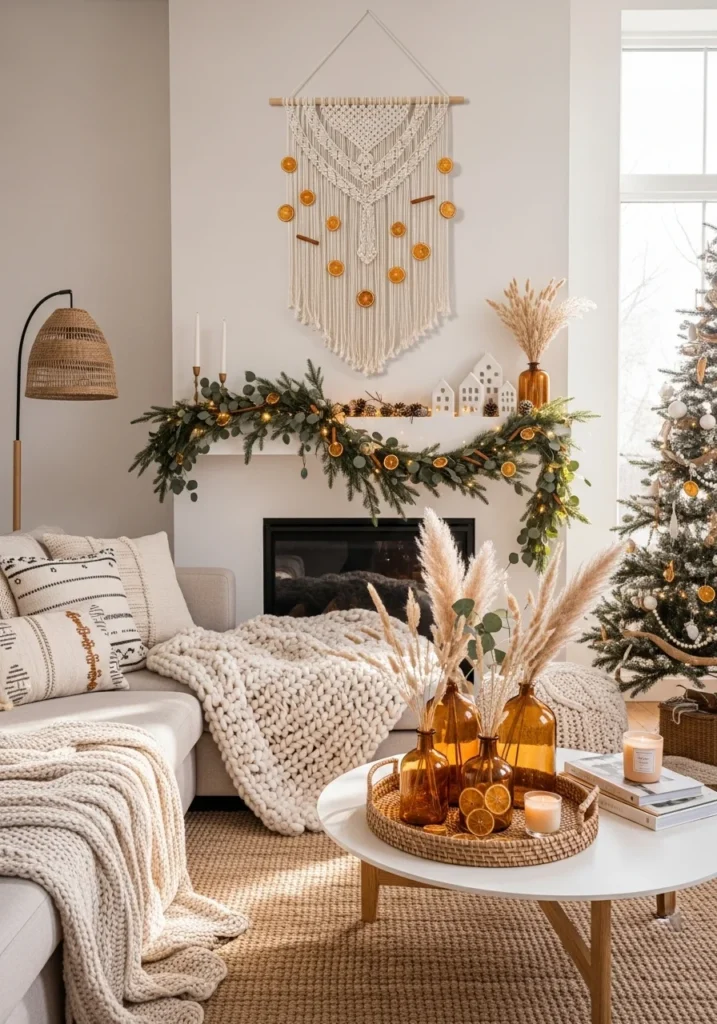 4. Modern boho Christmas decor ideas for living room with macramé and dried oranges