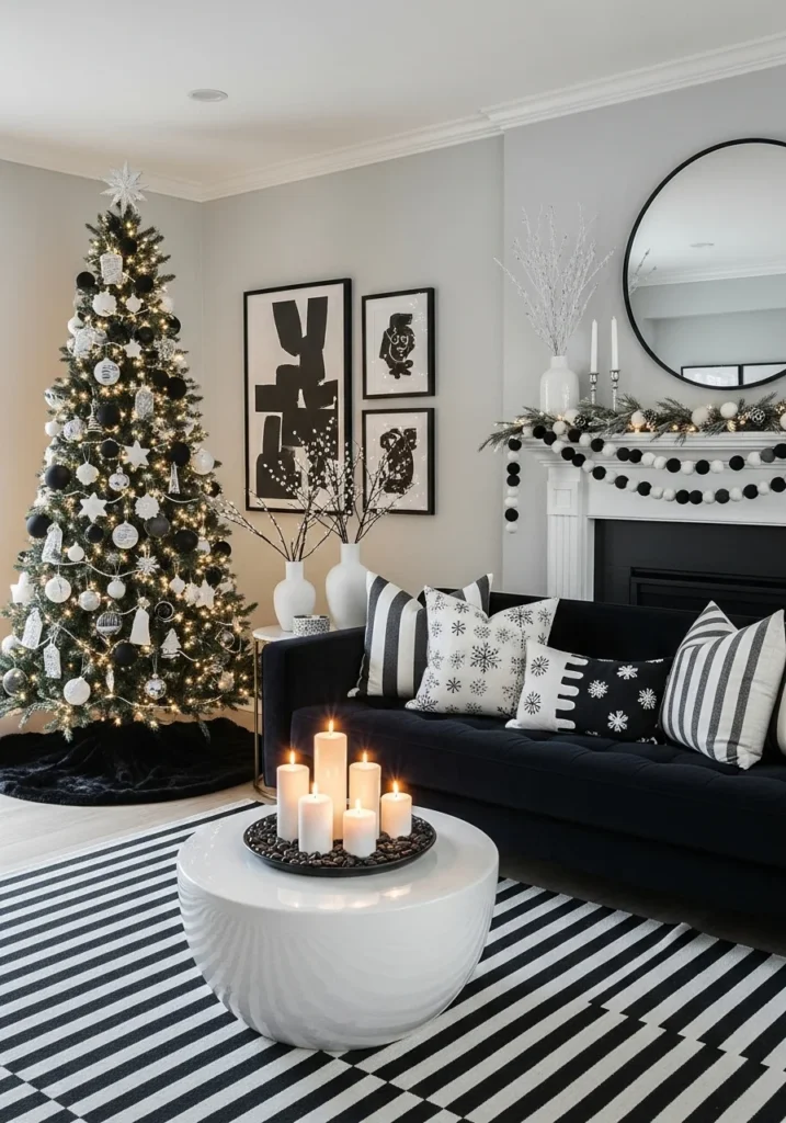 21. Modern monochrome Christmas decor ideas for living room black and white