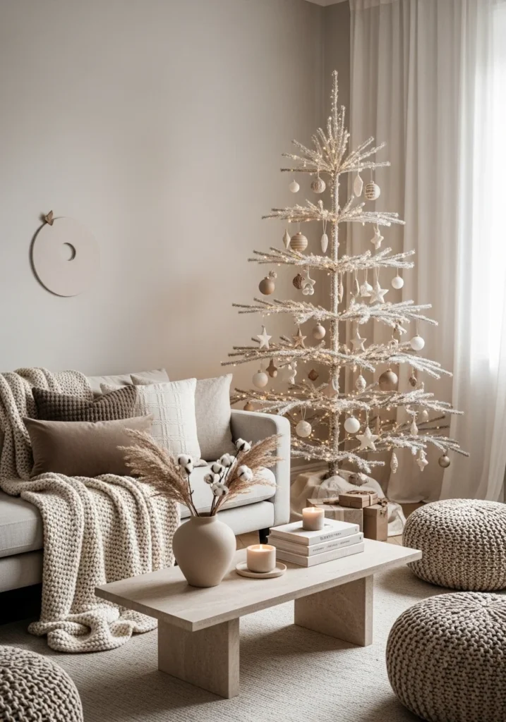 To elevate the design, incorporate subtle textures through knitted throws, wool rugs, and soft cushions. Candles and warm, ambient lighting help create a cozy, inviting feel while maintaining the minimalist style. Instead of bold colors, use muted metallic accents such as brushed gold or matte silver to add a refined festive touch.