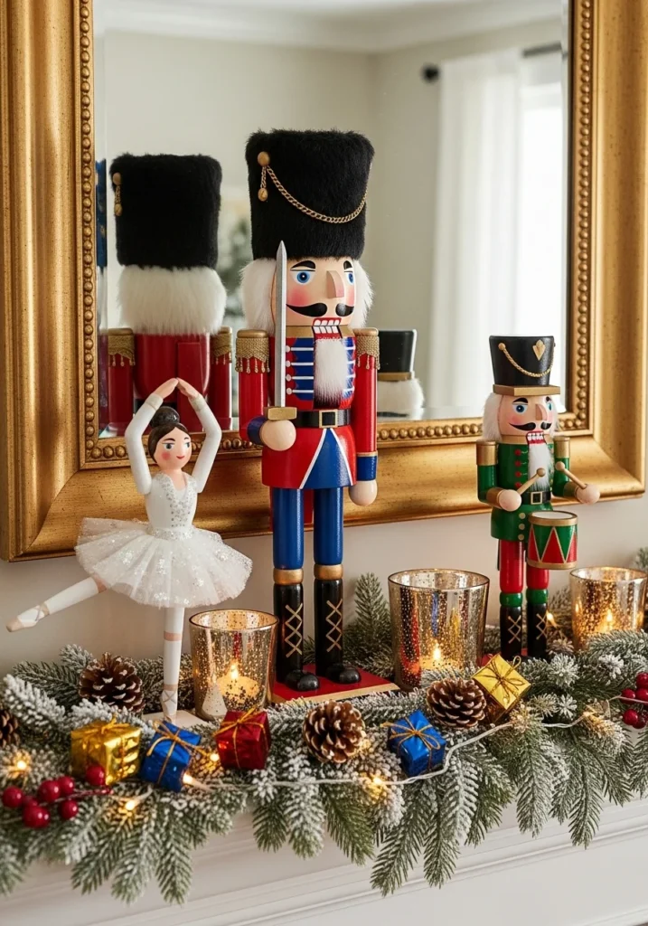 38. Nutcracker-themed Christmas decor ideas for living room mantel display