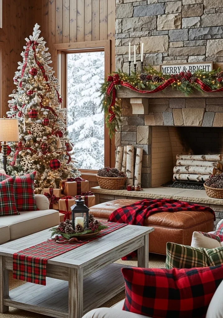 Rustic cabin Christmas décor embraces the charm of cozy winter lodges, making the living room feel warm and inviting. Natural materials, earthy tones, and traditional patterns form the foundation of this style. Plaid textiles, such as blankets and pillows, introduce classic cabin character and seasonal cheer.