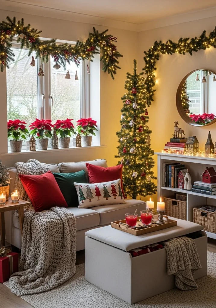 Vertical decorating techniques, including hanging garlands, floating shelves, and window décor, make efficient use of available space. Multifunctional pieces such as storage ottomans or decorative baskets provide both practicality and seasonal charm. Soft lighting, including fairy lights and candles, adds warmth without taking up valuable floor space.