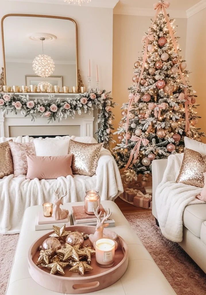 Soft glam Christmas décor combines elegance, luxury, and subtle feminine charm in the living room. Blush accents, gold metallics, and soft textures create a sophisticated and inviting holiday environment. A tree decorated with pink ornaments, delicate ribbons, and sparkling lights becomes a beautiful focal point.