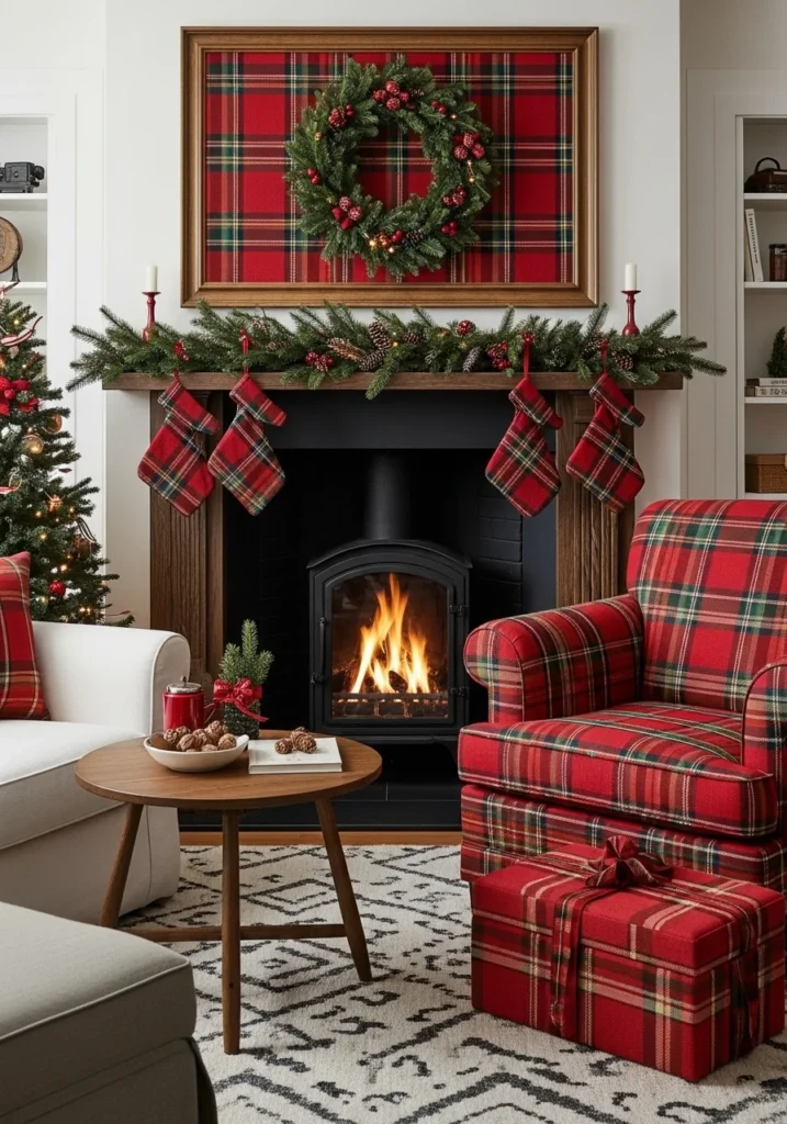 Traditional plaid Christmas décor evokes a nostalgic and comforting holiday atmosphere, making the living room feel warm and welcoming. Classic plaid patterns in red, green, and neutral tones instantly create a cozy winter aesthetic. Incorporating plaid blankets, pillows, and stockings establishes a familiar and timeless seasonal foundation.