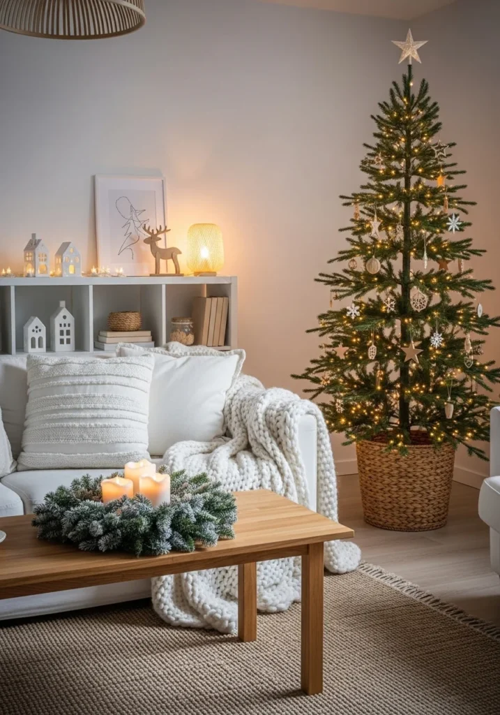 Scandinavian minimalist Christmas decor embraces simplicity, clean lines, and a calming atmosphere, making it ideal for a modern living room. The focus stays on neutral tones such as white, beige, and soft greys, complemented by natural materials like wood and linen. A slim, simple Christmas tree decorated with understated ornaments enhances the serene aesthetic without overwhelming the space.