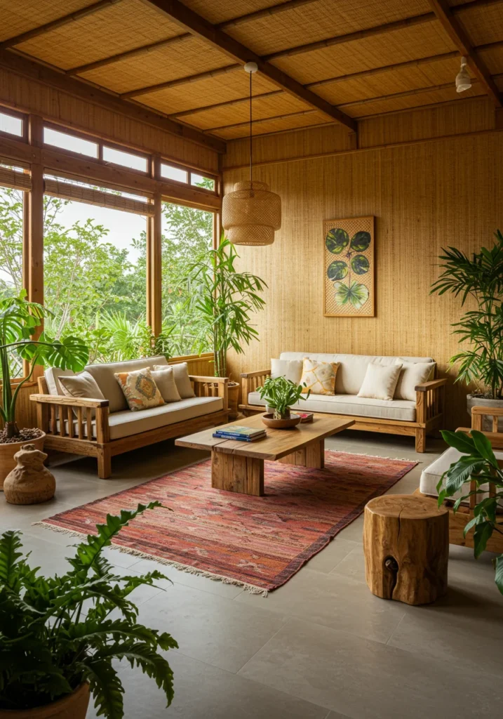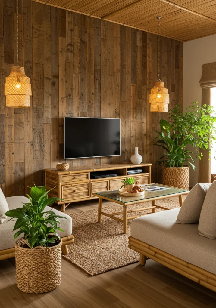 Eco-friendly living room design using reclaimed wood and bamboo elements