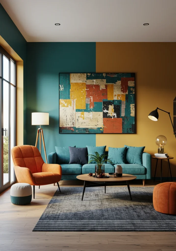 A color-blocked living room featuring bold hues and statement wall art makes a striking visual impact. Carefully selected color combinations—such as teal and mustard, coral and navy, or blush and charcoal—define distinct zones within the space. Clean geometric divisions create structure, while large-scale artwork adds a sense of personality and drama.