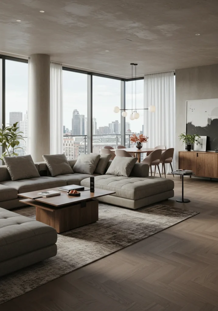 A city apartment living room designed with an open-concept layout and smart furniture emphasizes efficiency, versatility, and modern style. Neutral color schemes combined with sleek, modular furnishings create a sense of continuity throughout the space. Multifunctional pieces—such as convertible sofas, nesting tables, or hidden storage units—optimize limited square footage without compromising comfort.