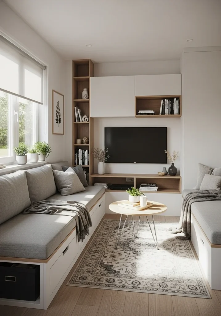 Mirrors and vertical storage maximize spatial efficiency without compromising aesthetics. Minimal yet personal decor keeps the space intimate and functional. This approach proves that even the smallest living rooms can feel spacious, inviting, and beautifully curated when designed with intention and balance.