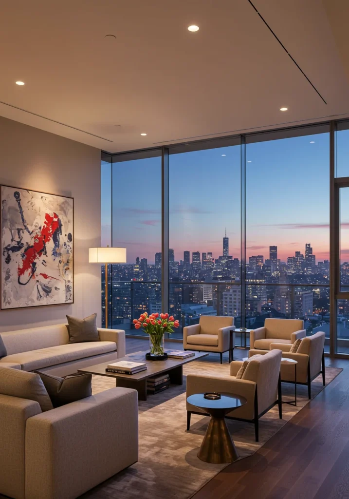 A contemporary penthouse living room with panoramic skyline views celebrates modern architecture and urban sophistication. Expansive floor-to-ceiling windows serve as the focal point, framing breathtaking vistas while flooding the space with natural light. The interior design emphasizes clean lines, premium materials, and open layouts to enhance the sense of scale and airiness.