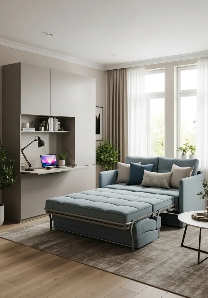 Convertible living rooms are the epitome of adaptability, seamlessly shifting between relaxation, work, and entertainment zones. Hidden desks, foldable sofas, and modular storage units allow the space to transform effortlessly as needs change throughout the day. The design relies on clean lines, neutral tones, and clever engineering to maintain visual simplicity while maximizing flexibility.