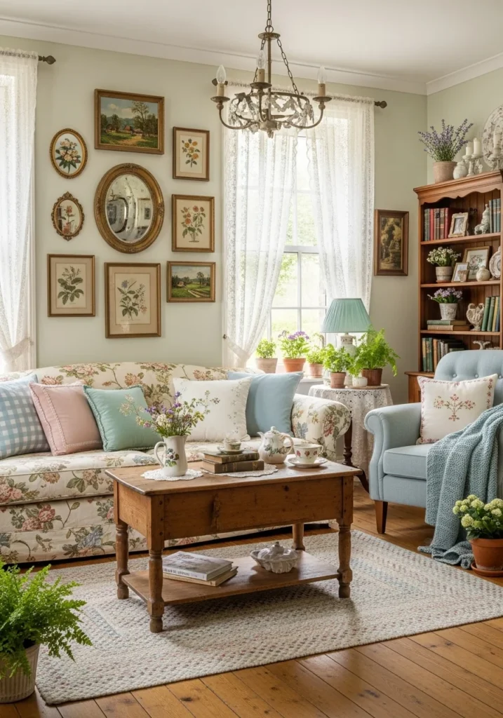 Cottagecore living room inspiration with vintage patterns and soft pastels