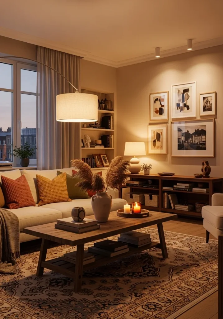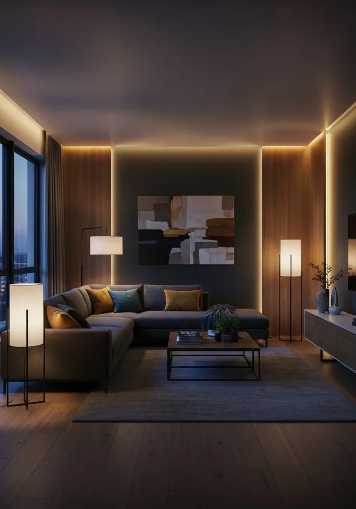 An evening living room designed with layered lighting and warm tones offers a sanctuary of relaxation and sophistication. Multiple light sources—table lamps, recessed fixtures, and wall lights—create dimension and ambiance. Warm color temperatures between 2700K and 3000K complement soft furnishings and deepen the room’s inviting glow.