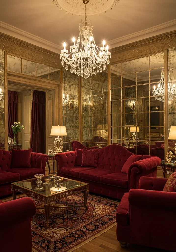 A Hollywood glam living room evokes the allure of classic cinema and old-world glamour. Rich velvet sofas in jewel tones create a sumptuous foundation, while mirrored furniture, metallic accents, and crystal lighting add sparkle and sophistication. The design often incorporates symmetry and balance, using statement pieces such as ornate mirrors or chandeliers to establish visual drama.