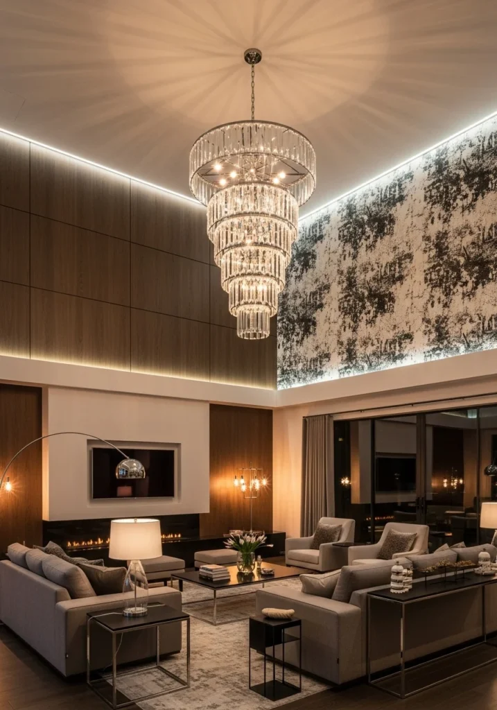 A living room featuring a statement chandelier and accent wall illumination exemplifies modern sophistication. The chandelier serves as a sculptural centerpiece, adding drama and vertical interest to the room, while concealed lighting enhances architectural features such as textured walls or artwork. The interplay between focal and ambient light establishes depth and visual rhythm.