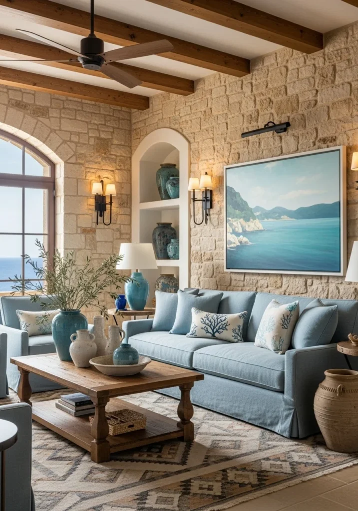 A Mediterranean-style living room embodies warmth, relaxation, and timeless charm. Stone textures—whether in the form of accent walls, flooring, or decorative elements—anchor the space in natural beauty, while coastal blues and sun-washed whites create an airy, tranquil ambiance. The palette draws inspiration from sea and sky, complemented by warm terracotta and sand tones.