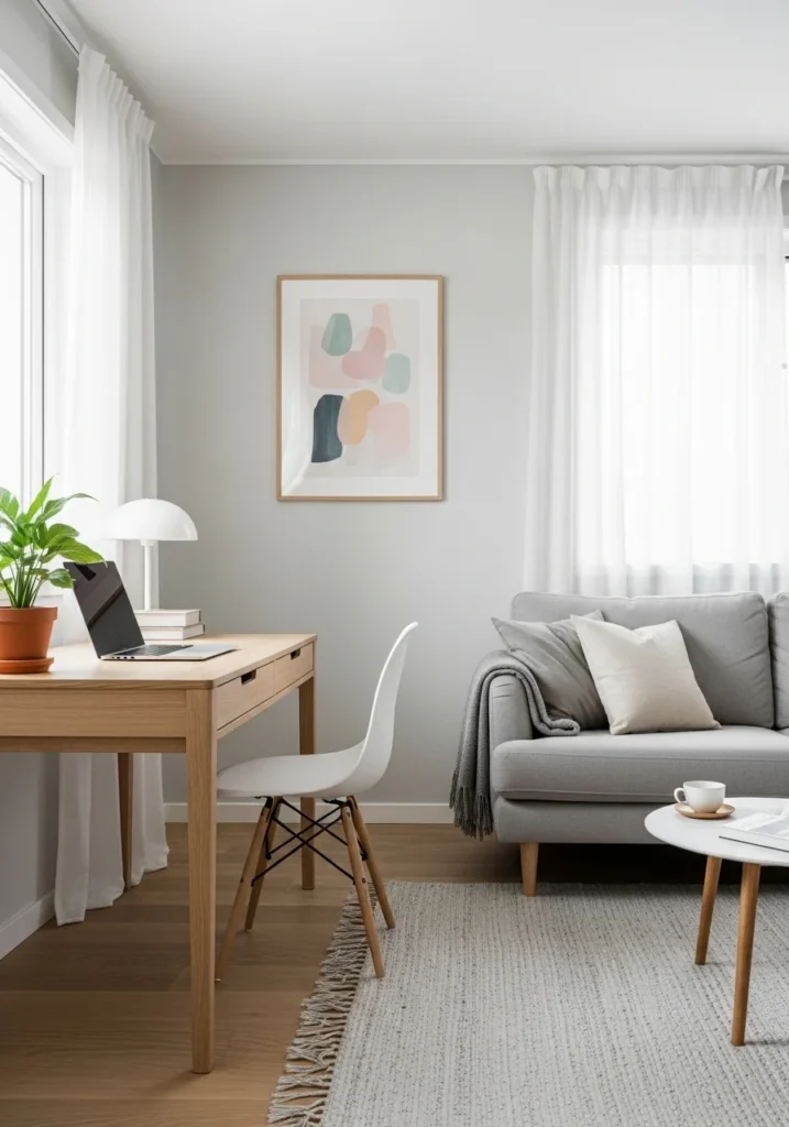 A minimalist living room designed for work-from-home balance prioritizes clarity, flexibility, and focus. The layout integrates a compact workstation that complements rather than dominates the space, maintaining the room’s primary function as a relaxation area. Clean lines, neutral tones, and clutter-free surfaces encourage calm and concentration.