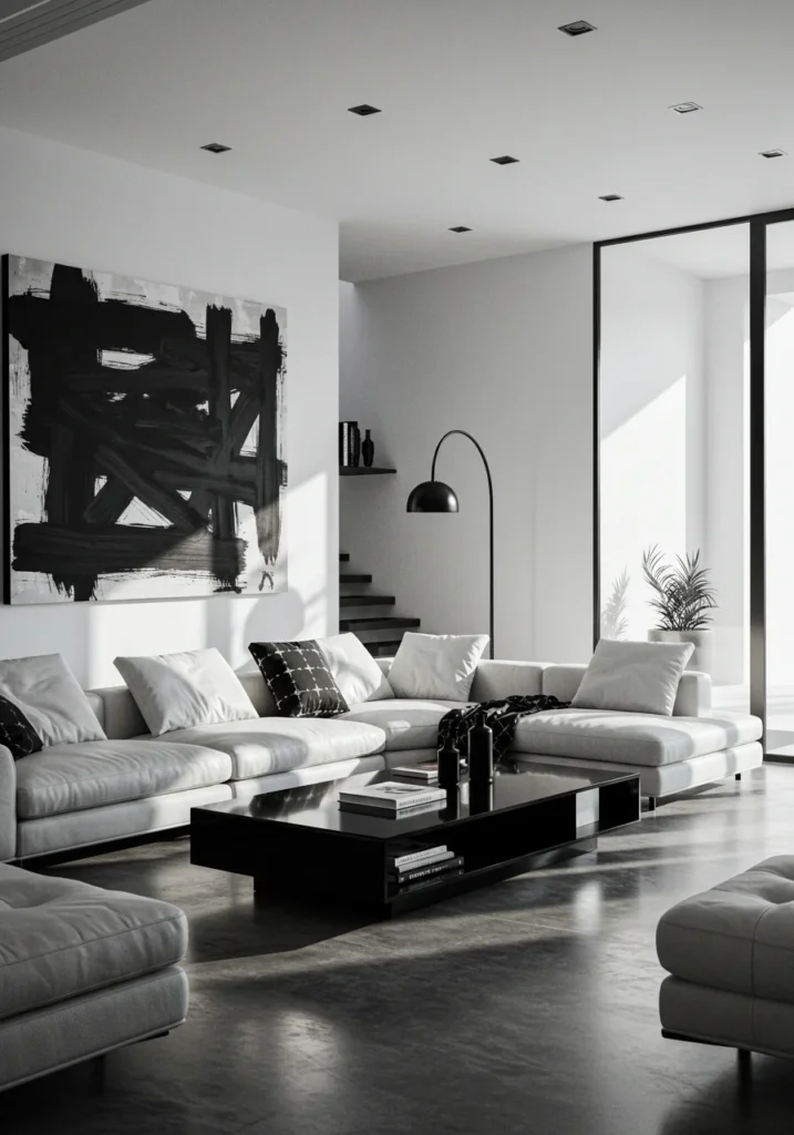 A modern monochrome living room captures sophistication through the dramatic interplay of black and white tones. This design aesthetic thrives on contrast, using sharp lines, geometric forms, and sleek finishes to create visual impact. White walls provide a crisp backdrop that enhances natural light, while black accents—such as metal fixtures, furniture frames, or statement decor—add depth and structure.