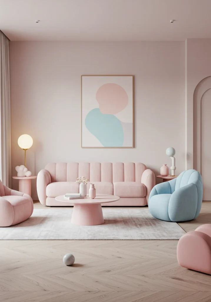 A modern pastel living room blends contemporary design with a sense of whimsy and approachability. Soft hues like blush pink, mint green, and powder blue establish a calming yet cheerful tone. Curved furniture pieces—rounded sofas, arched mirrors, and circular coffee tables—introduce movement and softness.