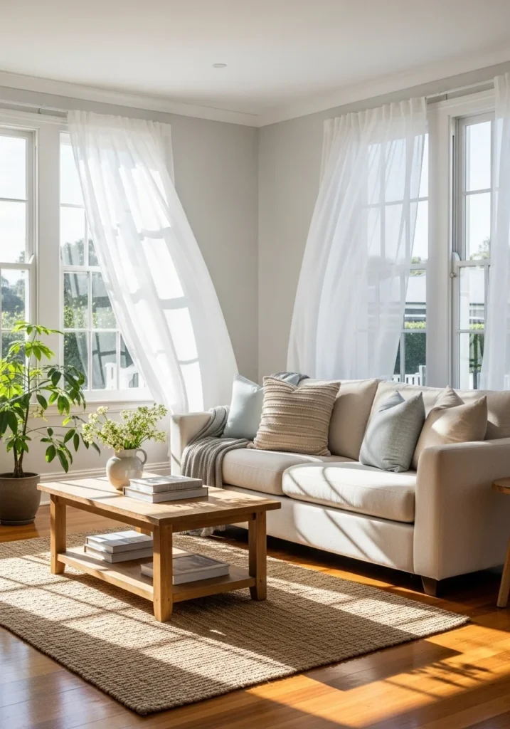 A living room designed around natural light celebrates openness, serenity, and visual harmony. Expansive windows and sheer curtains allow daylight to flood the space, enhancing both mood and spatial perception. The color palette typically leans toward soft whites, creams, and neutrals, amplifying brightness and creating a seamless flow between interior and exterior.
