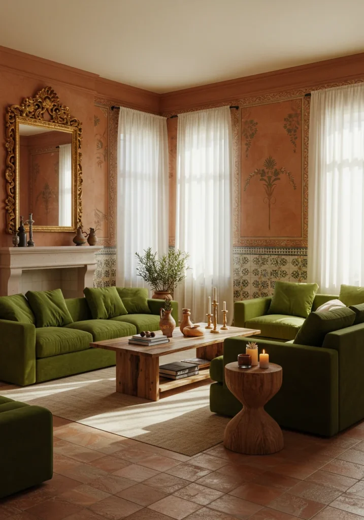 A living room styled in terracotta and olive green channels the warmth and serenity of Mediterranean design. The earthy color scheme reflects sunbaked landscapes and lush foliage, creating an inviting and organic atmosphere. Textured plaster walls, clay pottery, and rustic wooden accents enhance the natural aesthetic.