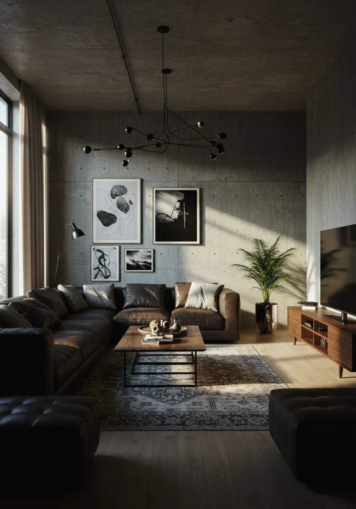 An urban chic living room with concrete walls and leather seating embodies understated luxury and metropolitan style. The cool, industrial quality of concrete serves as a minimalist backdrop, allowing warm leather tones and metallic details to shine. Sleek furniture lines, low-profile sofas, and glass accents enhance the contemporary appeal.
