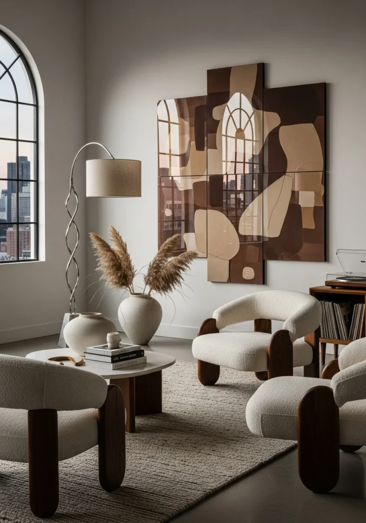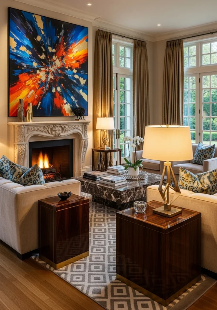 This rich living room is centered around a large abstract artwork that functions as both a focal point and an artistic statement. The artwork introduces movement, color, and personality, transforming the space into a gallery-inspired interior. Clean furnishings allow the art to command attention.