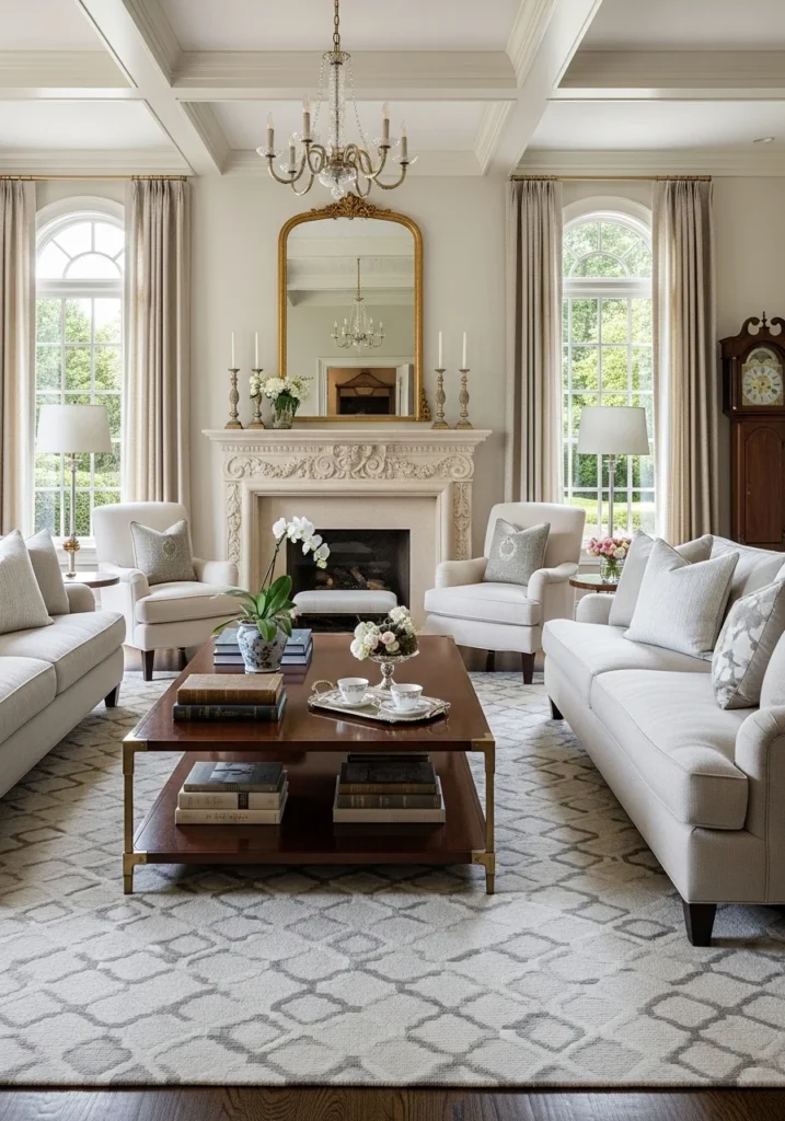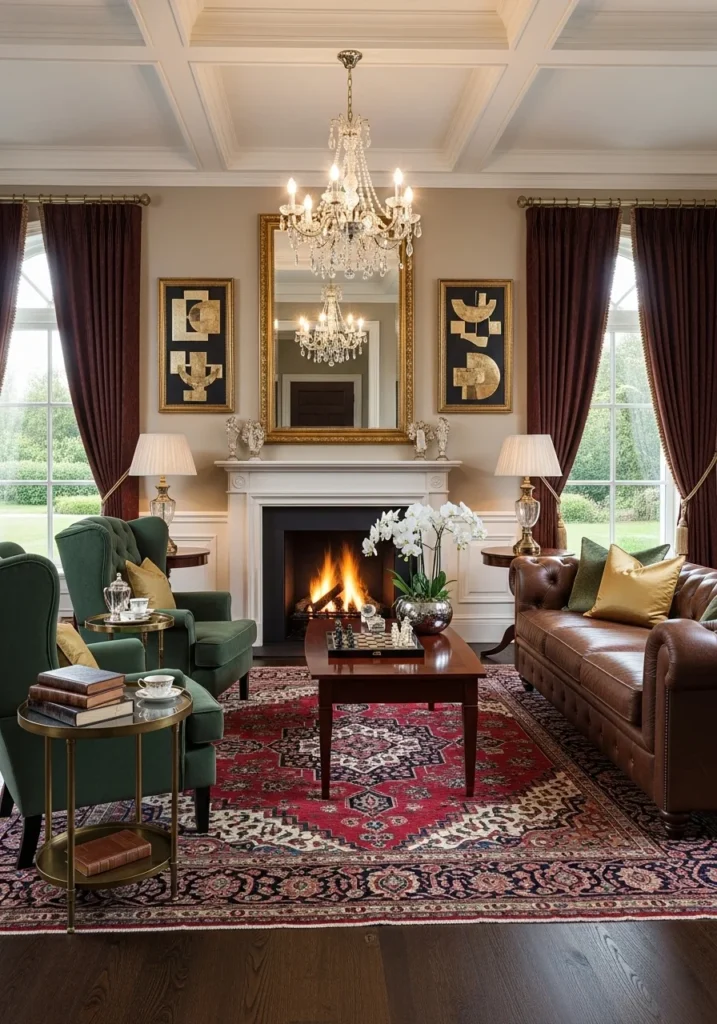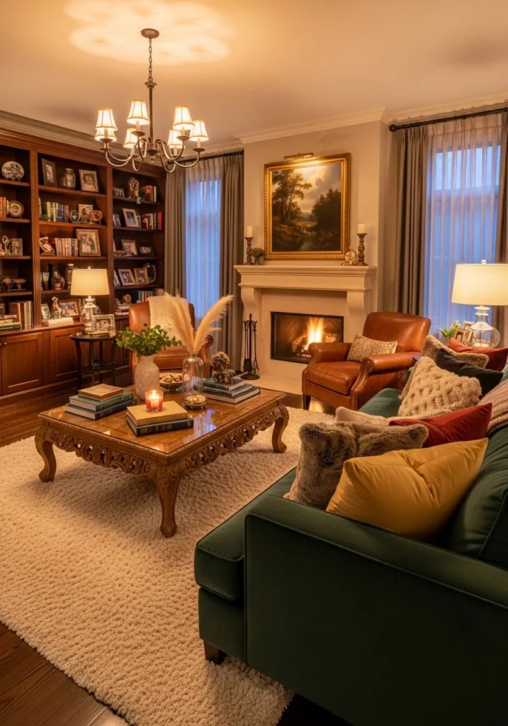 The cozy luxury vibe is enhanced by soft lighting and carefully selected textures, creating an inviting atmosphere ideal for winter evenings. Plush seating, layered fabrics, and warm tones contribute to a sense of intimacy without sacrificing refinement. The balance between elegance and comfort defines the room’s enduring appeal.